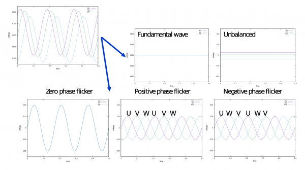 すべての三相交流は対称座標法からも分かる通り、「基本波」及びそのオフセット、相間不平衡である「零相」「正相」「逆相」に分解することができます。このことから、対称的な交流波型を用いてすべての三相交流を表現できます。