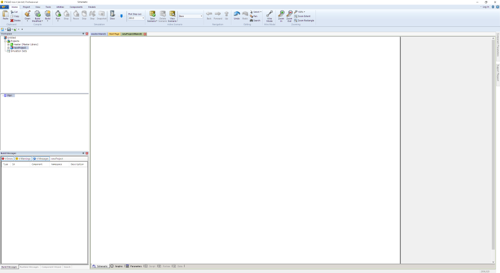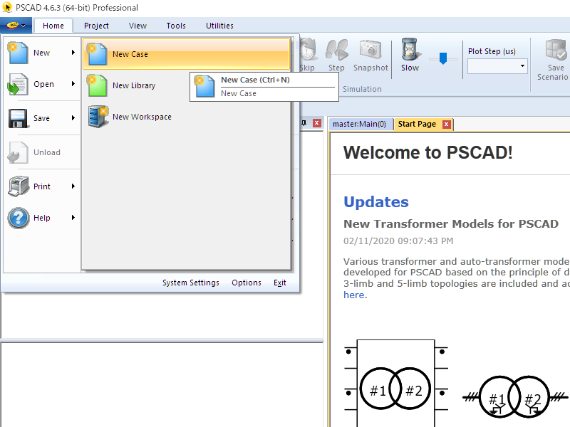 PSCADを起動後、左上のFile...より新規ワークスペース及び新規ファイル(ケース)を作成します。