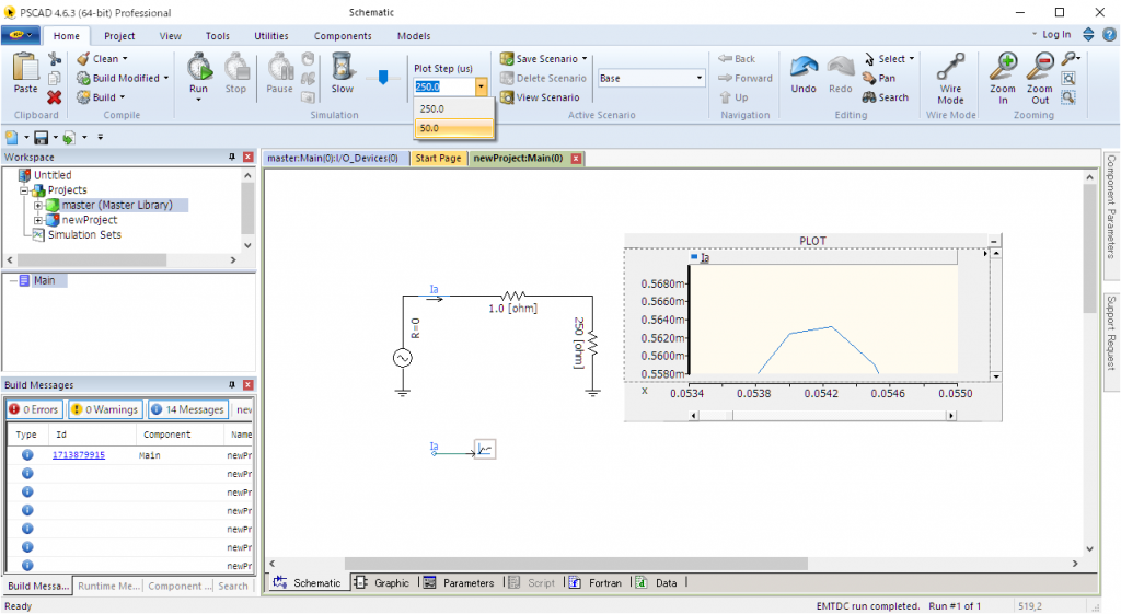 これはPSCADのグラフの単位が[kA]に設定されているため生じる現象です。そのため、低電圧を扱う場合には波形信号に1000を乗じることで、可読性が上がります。